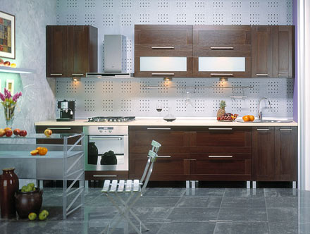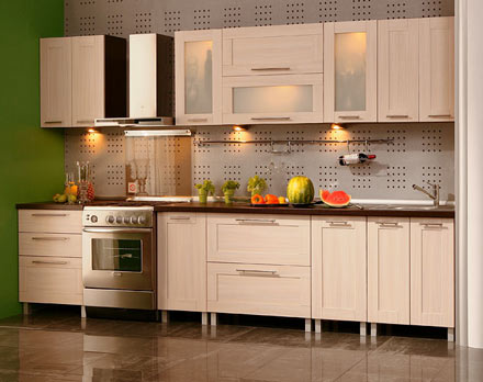 Инвариантность обеспечивается тремя декорами корпусов, изготавливаемых из ЛДСтП толщиной 16мм, двумя декорами столешниц из плит «постформинг» толщиной 28мм или 38мм. Двери, в том числе с вертикальным открыванием на газовых кронштейнах, и панели ящиков поставляются отдельными артикулами. Могут быть наборными рамочными, в том числе со стеклом, или цельными из ЛДСтП толщиной 18мм. На двери я панели ящиков устанавливаются металлические ручки релингового типа. Количество декоров фасадов пока ограничивается двумя. Планируется их расширение, в том числе с использованием глянцевых ЛДСтП. Настенные шкафы могут дополнительно оборудоваться комплектом освещения. Новинка 2008 года. Другие цвета и цены по модулям смотрите здесь -