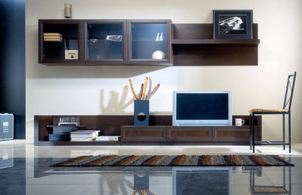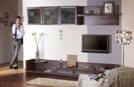 Гостиная «Аталия» Ограниченный набор элементов позволяет создать современную стенку для бытовой техники и необходимых аксессуаров жилой комнаты. Новинка 2008 года. Шкафы с стеклянными полками могут располагаться на стене в произвольном порядке. На дверях и ящиках отсутствуют традиционные ручки. Двери шкафов снабжены нажимными защелками, которые позволяют открывать их легким нажатием. Осознанный современный аскетизм оформления фасадов сочетается с утолщенными деталями полки и тумб.